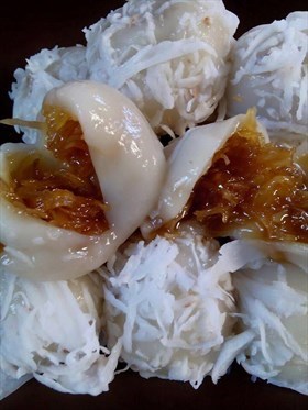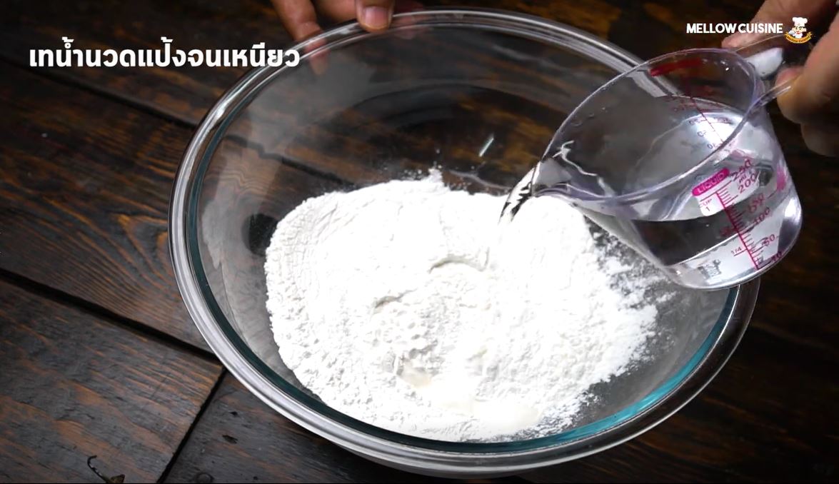 นำแป้งข้าวเหนียวผสมน้ำแล้วนวดให้เป็นเ นื้ อเดียวกันนำมาปั้นเป็นก้อนกลมๆ จากนั้นแผ่ให้เป็นแผ่นแบนๆ เพื่อห้อไ ส้ขนม
