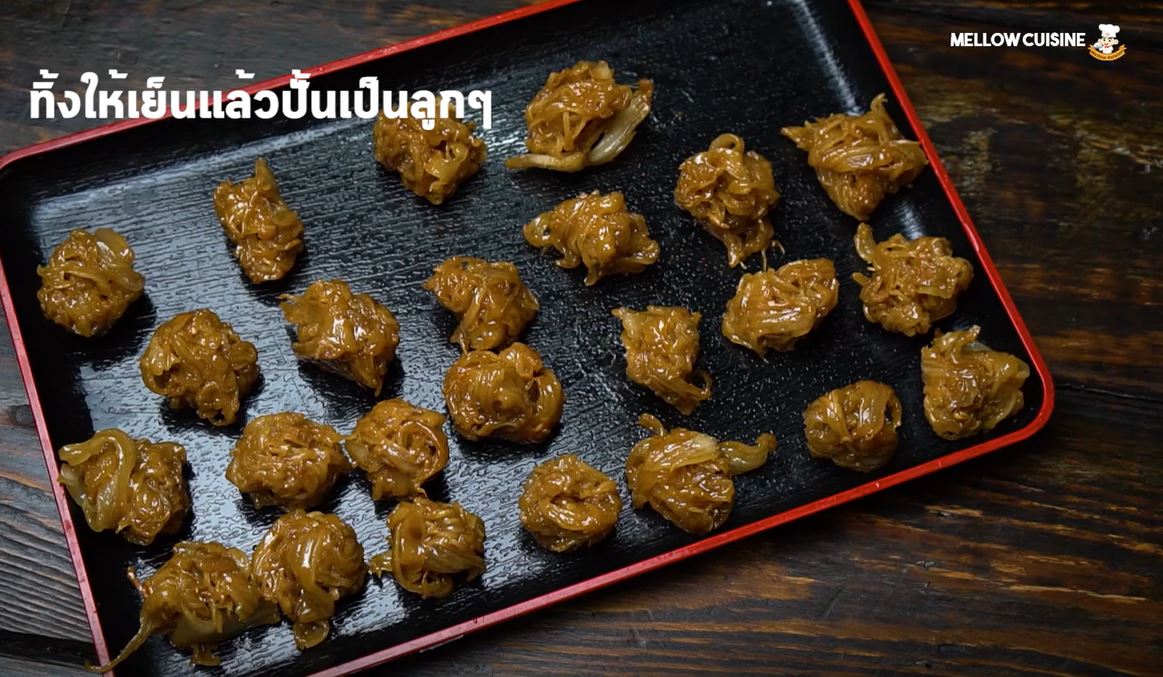 พักไว้ให้เย็นแล้วนำมาปั้นเป็นก้อนกลมๆ ขนาดพอดีคำ