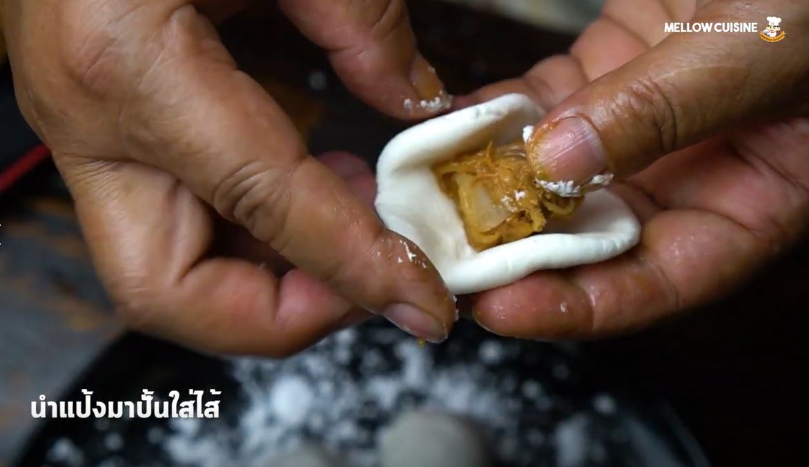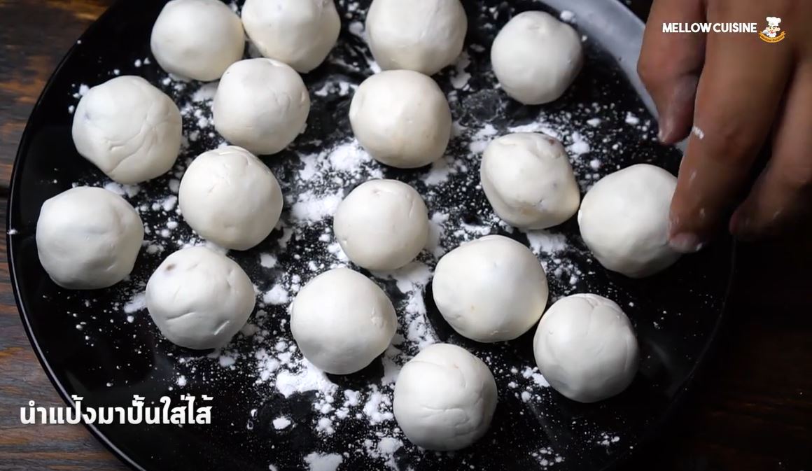 นำแผ่นแป้งที่ได้มาหุ้มไ ส้ขนมที่เตรียมไว้ห่อให้มิ ดชิ ดเป็นก้อนกลมๆ