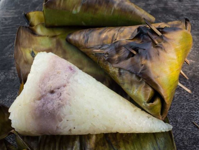 3.ใส่ข้าวเหนียว ลงในใบตองพอประมาณ ตักไ ส้ใส่เล็กน้อย