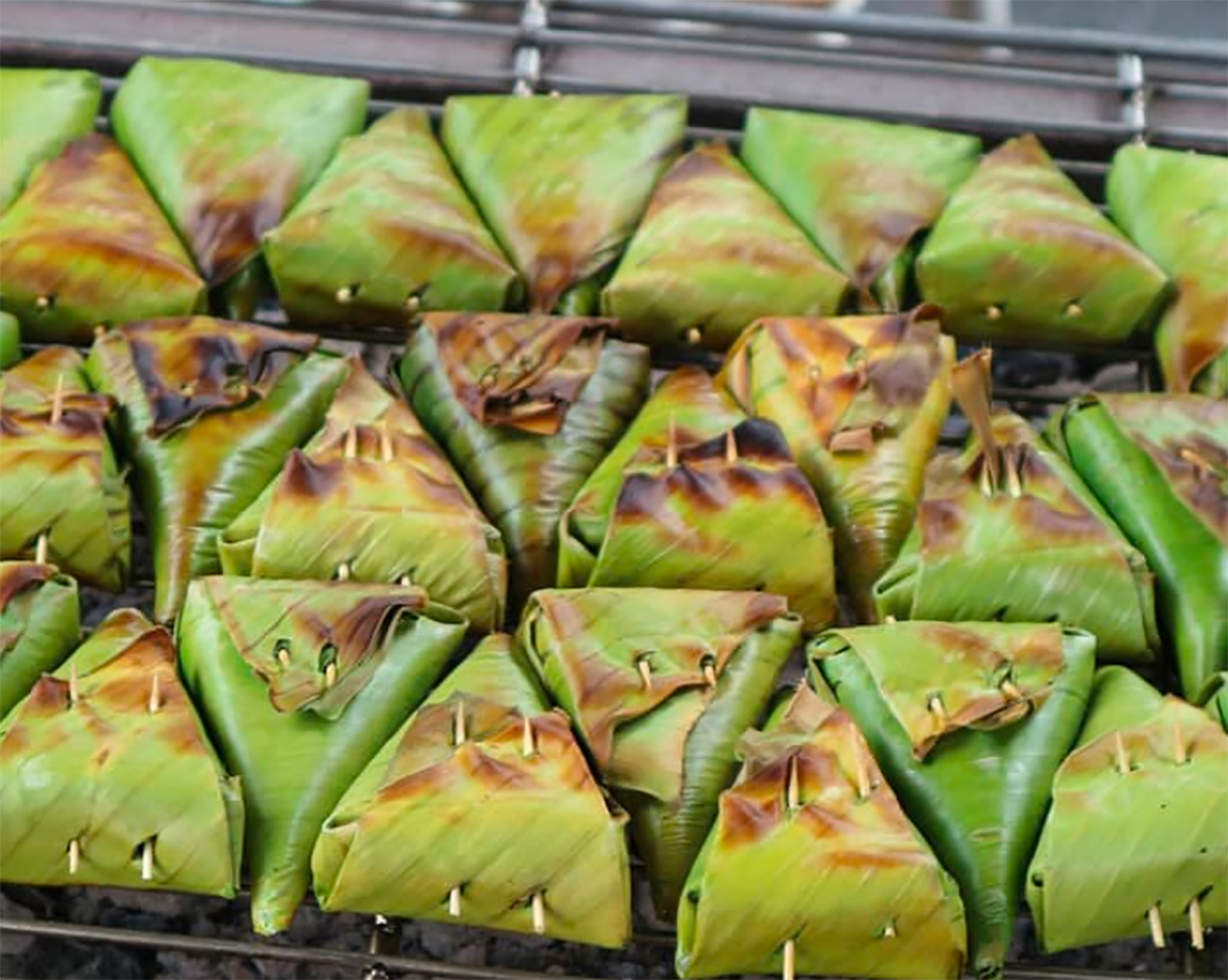 6.นำไปปิ้ ง ด้วยไ ฟอ่อนๆ จนเหลืองหอม ห่อข้าวเหนียวที่ปิ้ งสุ ก แล้วจะมีขนาดประมาณ 1X3 นิ้ว