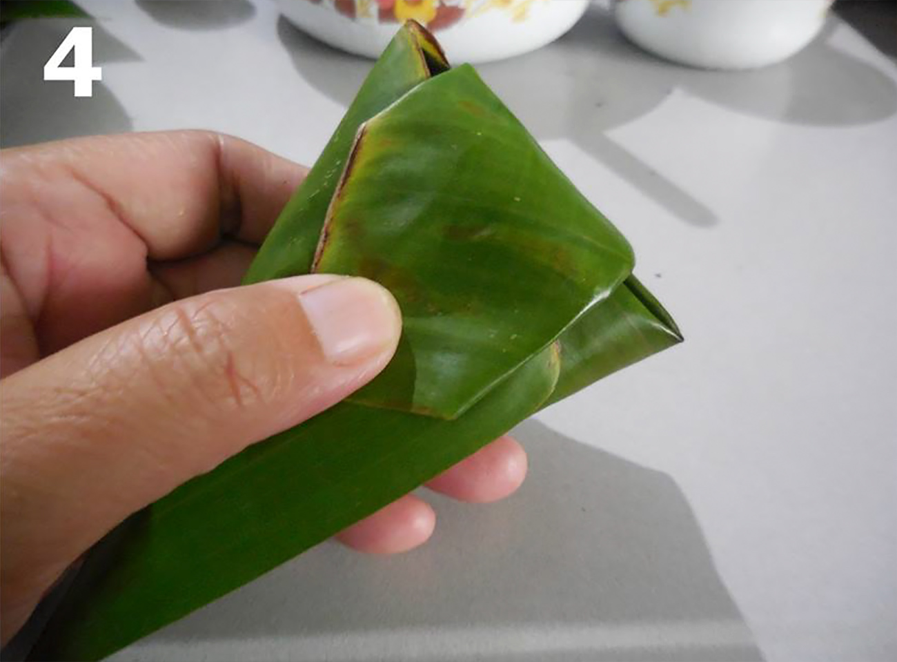 4.ใส่ข้าวเหนียวปิดทั บลงไปอีกชั้นหนึ่ง พับใบตองปิด