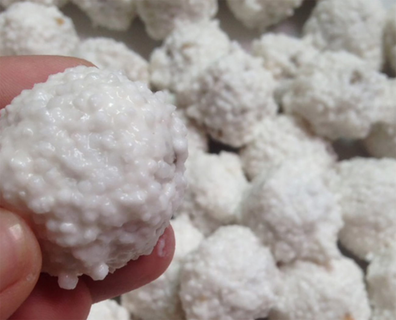 9.ถึงเวลาให้กรองน้ำออก และเห็นว่าสาคูพองตัว จากนั้นให้ขยำเม็ดสาคูพอให้ติดกัน ห้ามนวด จะเหนียวเกินไป