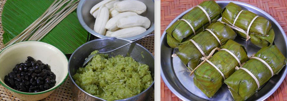 – ใส่ถั่วและข้าวเ ม่ าที่ผัดลงบนใบตอง ใส่กล้วยแล้วห่อ มั ดด้วยต อ ก นำไปนึ่งบนน้ำเ ดื อ ด 20-25 นาที