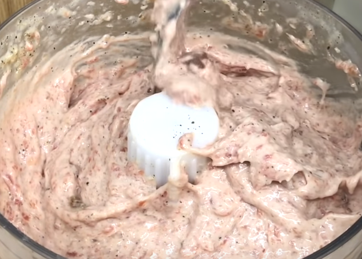 2.ใส่เ นื้ อหมูบ ดลงในเครื่องปั่ นอาหาร แล้วค่อยๆเทส่วนผสมของเ ห ล วเมื่อครู่ที่เตรียมไว้ลงไป ปั่ นจนเ นื้ อเนียนละเอียดเป็นเ นื้ อเดียวกัน