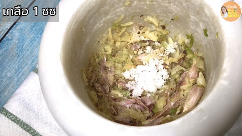 1. แม่ผึ้งจะตำสามเกลอ (กระเทียม พริกไทยร ากผักชี) +เกลือ 1 ชช เพื่อเพิ่มรสช าติอร่อยและความหอมให้กับไก่อย่ างกะทิ