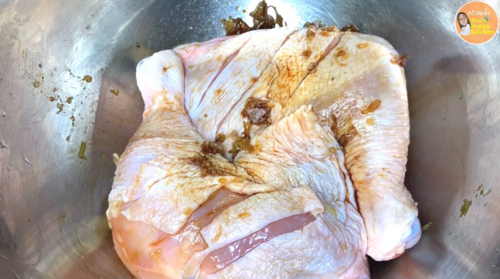 2. นำไก่ไปหมักกับเครื่องปรุง และสามเกลอ คลุกเคล้าให้เข้ากัน ใส่กระทิ 3-4 ชตเพื่อช่วยทำให้เ นื้ อไก่