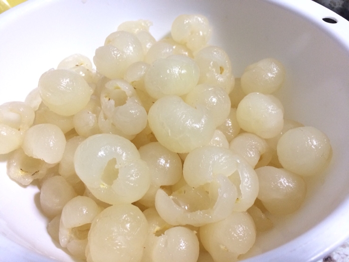 – เด็ดลำไยมาล้างน้ำให้สะอาด และทำการแกะเ นื้ อ เราไม่มีมี ด ค ว้ านเลยใช้ปลายช้อนกลางมาแงะเม็ดออกค่ะ