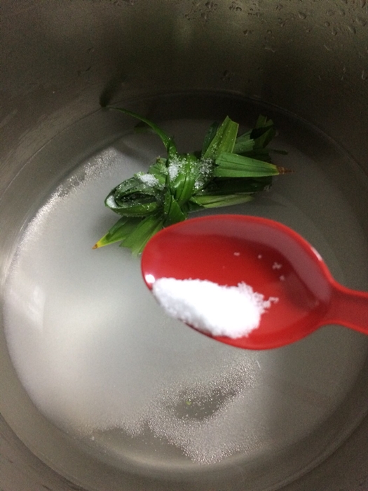 – ตั้งหม้อน้ำเชื่อม ส่วนผสม น้ำตาลทราย , เกลือ (ชิมรสตามชอบ) และถ้าใครมีใบเตยใส่ไปด้วยเลยค่ะ จะทำให้เชื่อมหอม