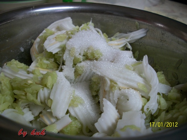 7. ใส่น้ำตาลทรายลงไปคนให้เข้ากัน จนน้ำตาลละลายหมด