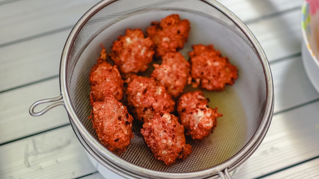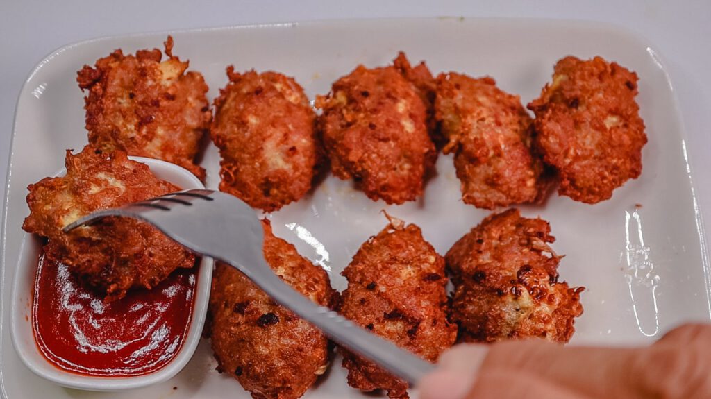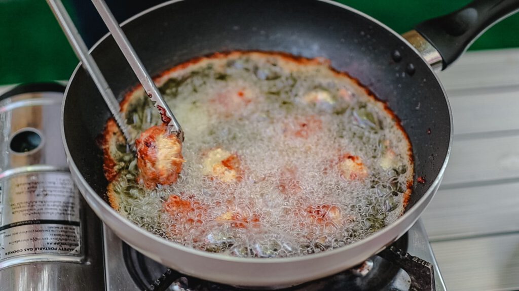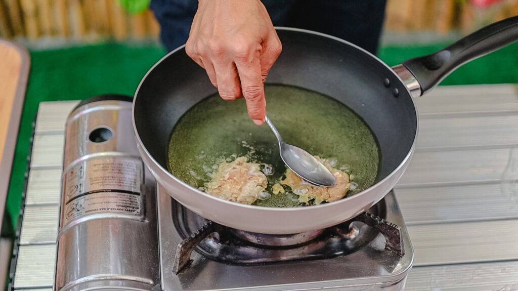 3.ตั้งกระทะเปิดไ ฟปานกลางใส่น้ำมันรอให้ร้ อ นแล้วปั้นหมูให้ได้ชิ้ นพอดีคำลงไปทอด