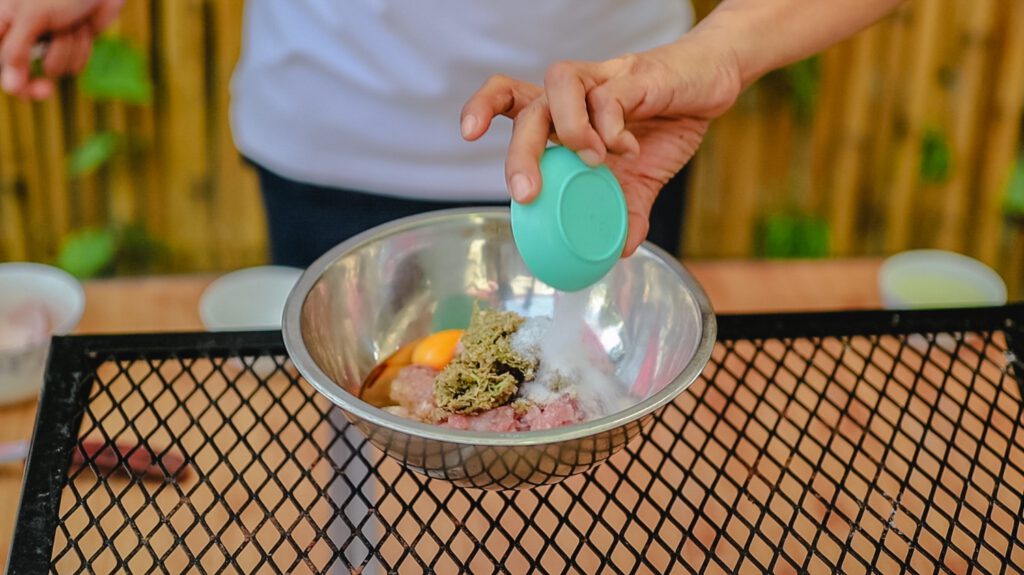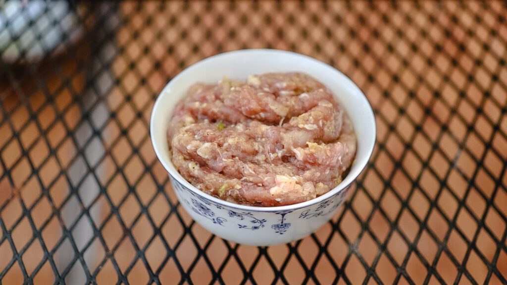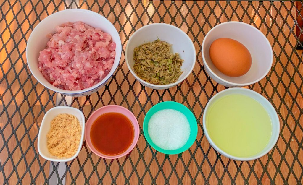 1.นำหมูสั บใส่ลงในภาชนะสำหรับผสม ต อ กไข่ไก่ไป ตามด้วยสามเกลอ ผงปรุงรส ซอสปรุงรส และน้ำตาลทราย