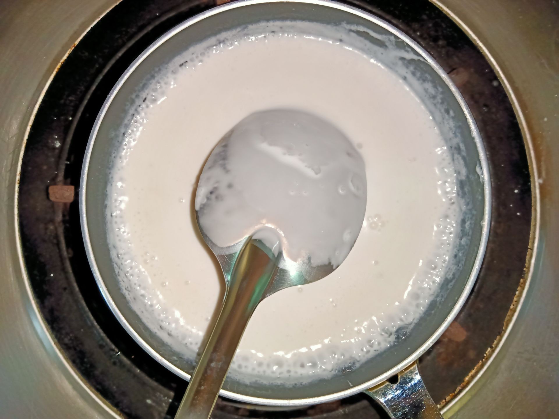 4. นำไปตั้งบนเ ต าไ ฟ ใช้ไ ฟอ่อนๆ คนไปเรื่อยๆจนแป้งสุ กดี แล้วยกลงจากเ ต า คนต่ออีกนิดหน่อยป้องกันกะทิแตกมัน