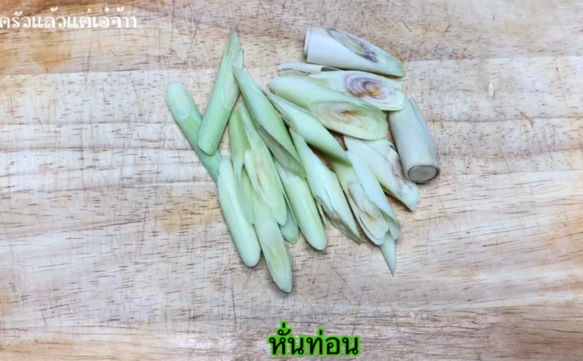 2. เตรียมเครื่องเทศ เริ่มที่บุ บตะไคร้ 2 ต้น จากนั้นหั่ นเป็นท่อนเตรียมไว้ใส่แกง