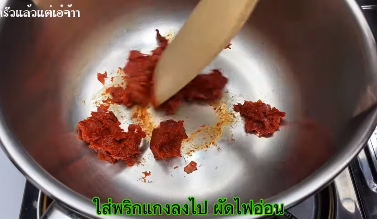 – การผัดพริกแกงในขั้นตอนแรกให้ใช้ไ ฟอ่อน ผัดให้พอมีกลิ่นหอม ก็ใส่น้ำเปล่าได้เลย หากผัดนานพริกแกงอาจไ ห ม้