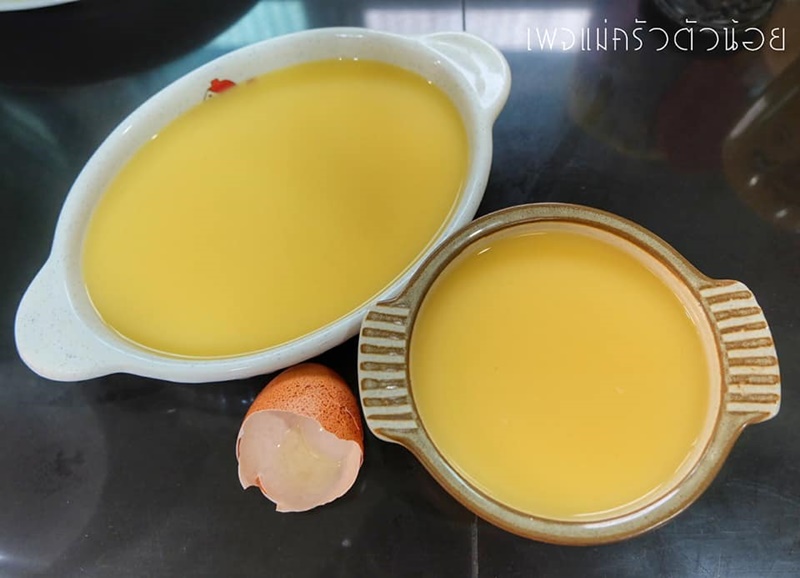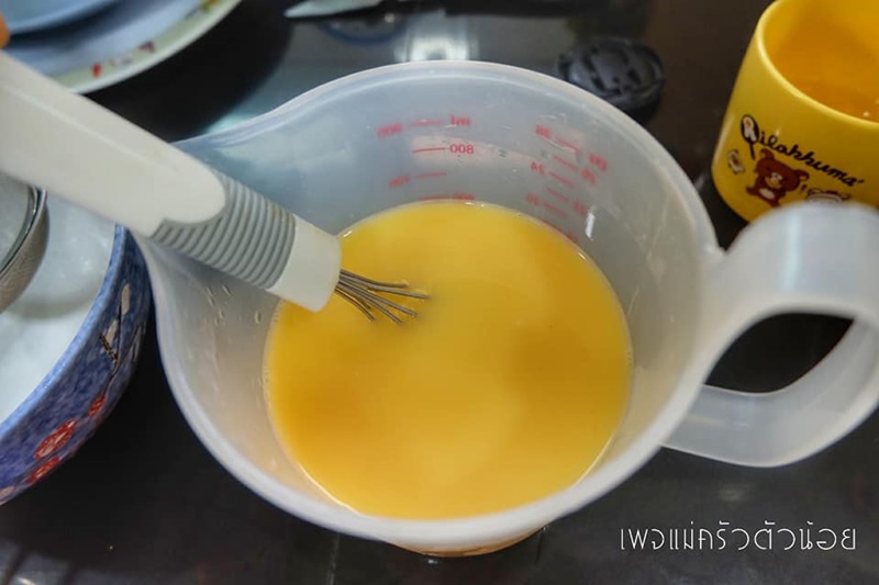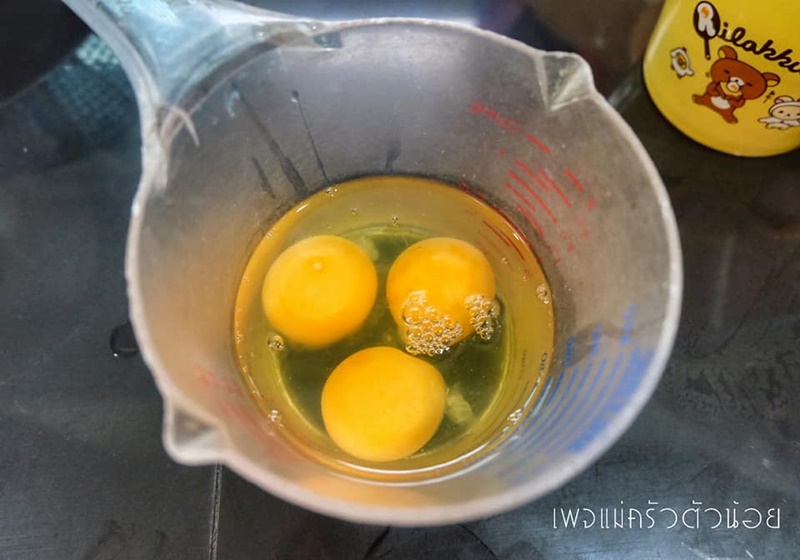 2. ใช้ตะกร้อมืออันเล็กๆ หรือส้อมคนวนเบาๆ ไม่ให้เกิดฟองอากาศ เทคนิคคือไม่ยกตะกร้อมือหรือส้อมเหนือไข่