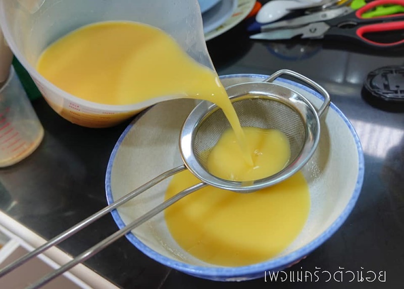 4. จากนั้นกรองผ่านกระชอนสองรอบเพื่อความเนียนของไข่ เราจะได้แบบนี้ พร้อมนำไปนึ่ง