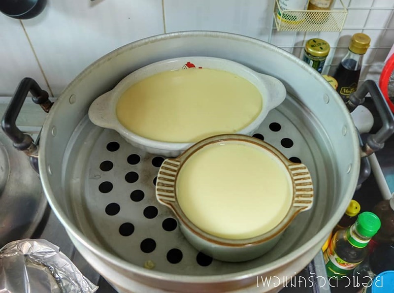 5. เทลงภาชนะที่จะนึ่ง แนะนำถ้วยเซรามิคหนาๆ เพื่อไม่ให้ไข่ตุ๋นได้รับความร้ อ นมากเกินไปจนเกิดฟองอากาศ
