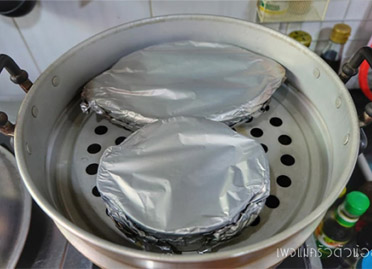6. นำฟอยล์มาปิดคลุมถ้วยกดรอบๆ ถ้วยให้ฟอยล์แน่นๆ ลดไฟในรังถึงลงเหลืออ่อนที่สุด แล้วนำถ้วยไข่ตุ๋นไปวาง