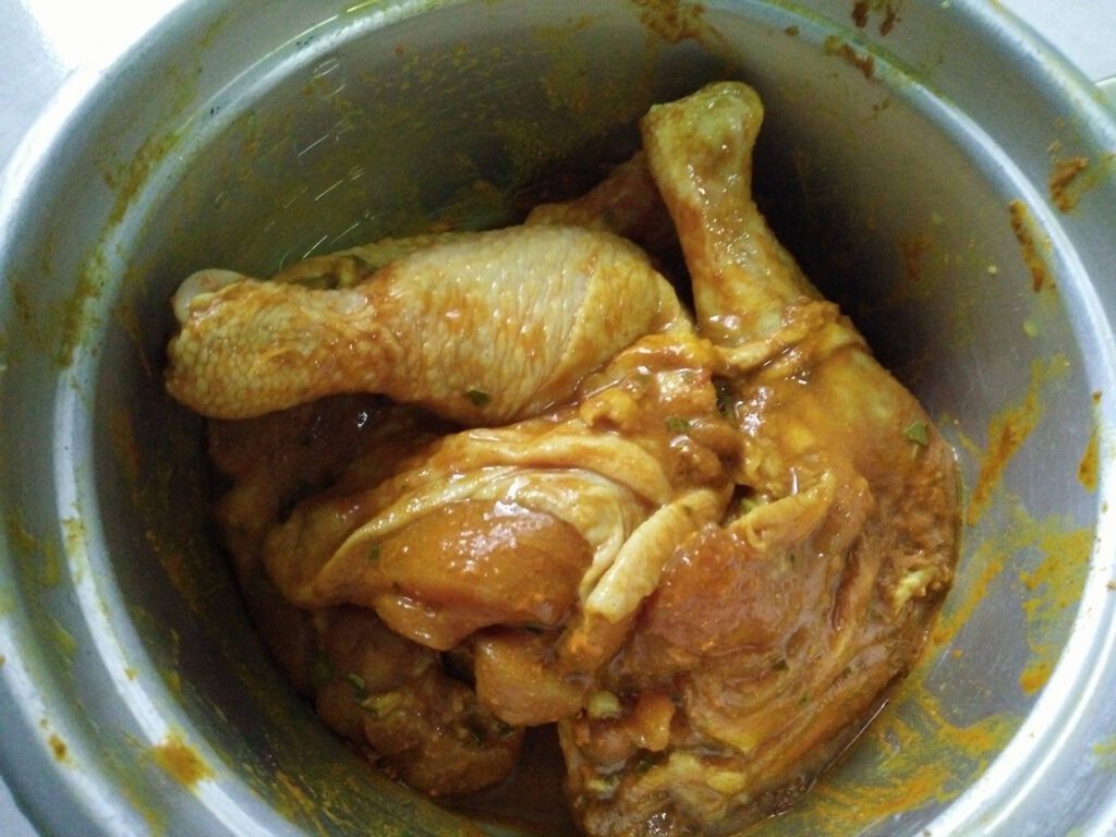 1. ล้างไก่ให้สะอาด คลุกด้วยผงข้าวหมกไก่ ตราโลโบ โยเกริต์ เกลือ น้ำตาล ( ไก่ 1 kg) ใช้โลโบ 2 ซองใหญ่