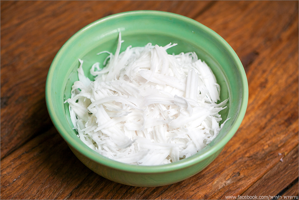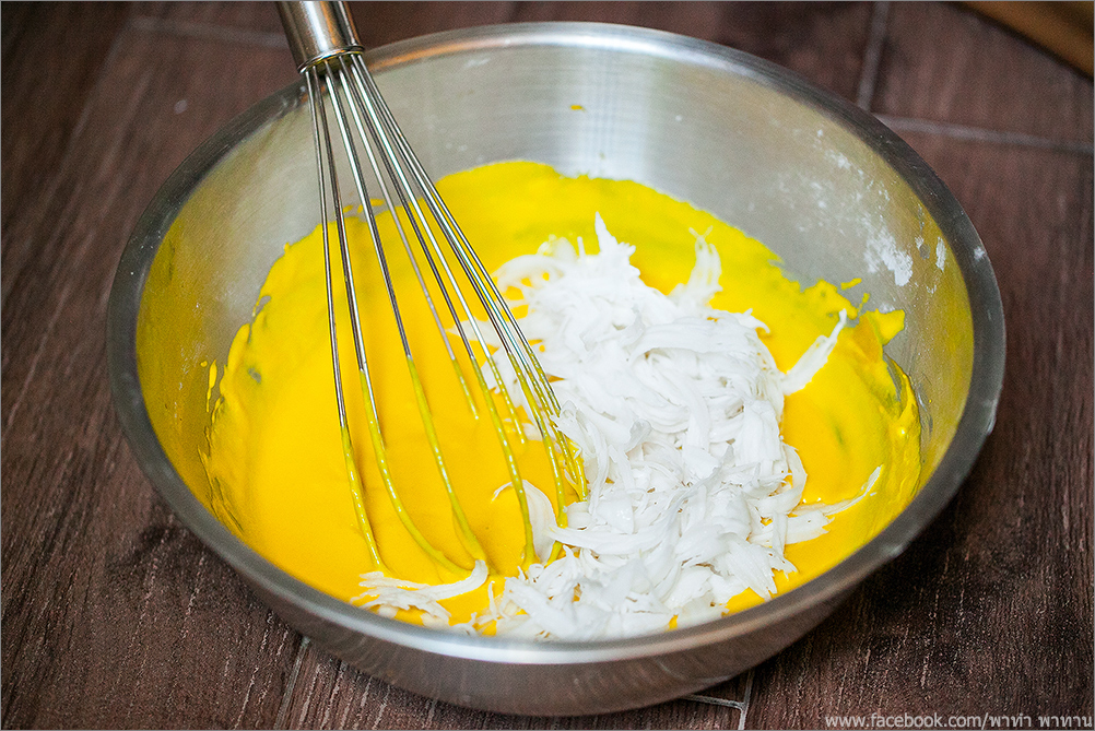 -เมื่อเราคนจนส่วนผสมเข้ากันดีแล้ว ก็ใส่เ นื้ อมะพร้าวขู ดลงไปแล้วคนส่วนผสมให้เข้ากันอีกครั้งหนึ่ง