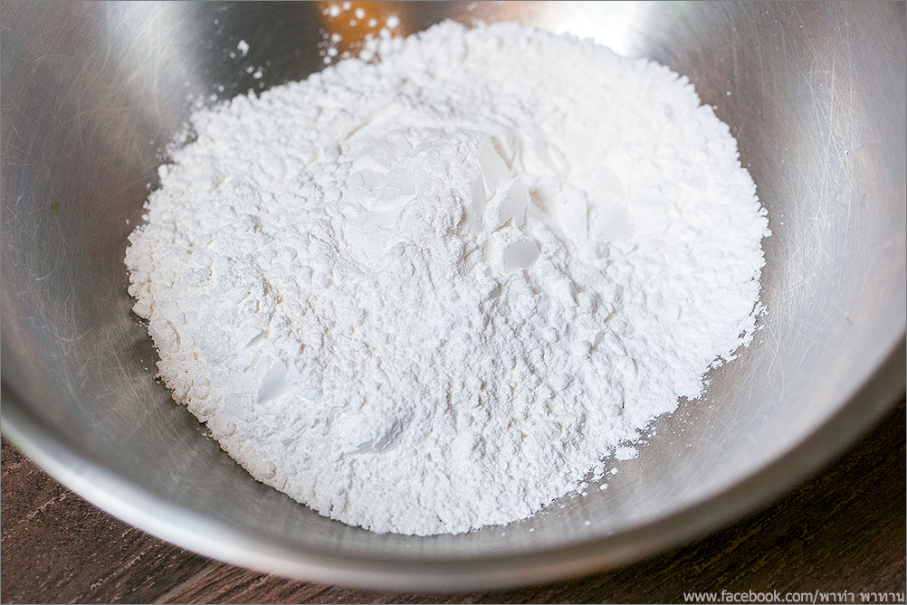 -จากนั้นใส่แป้งข้าวเจ้า แป้งมัน แป้งท้าวย ายม่อม ลงในภาชนะ