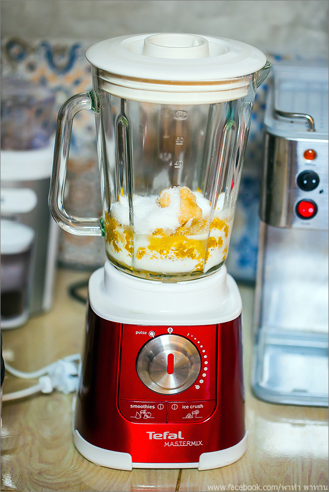 -จากนั้นนำกะทิที่เหลือ น้ำตาลปิ๊บ น้ำตาลทราย เ นื้ อฟั กทองและเกลือ เข้าเครื่องปั่นเพื่อให้เ นื้ อละเอียด