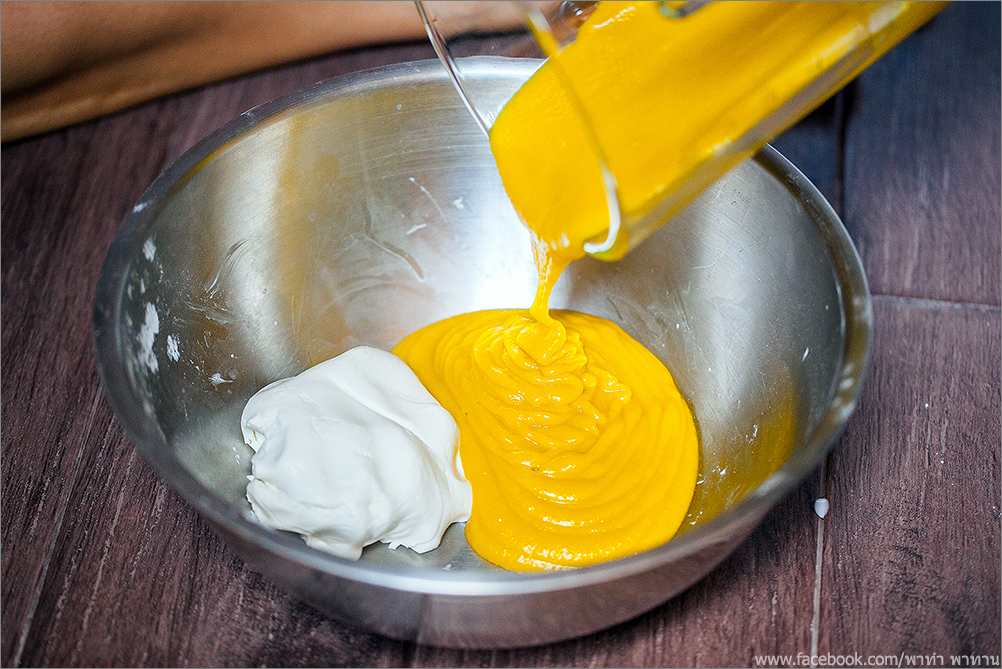 -จากนั้นนำส่วนผสมที่เราปั่ นแล้วเทผสมลงในแป้ง