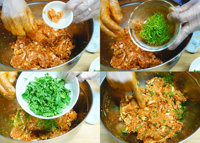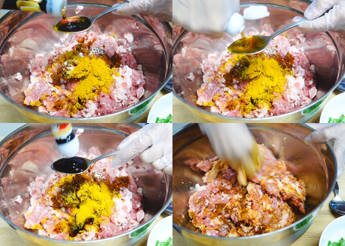 2. ปรุงรสด้วย ซีอิ้วขาว น้ำป ล า น้ำมันหอย แล้วคลุก นวดให้เข้ากัน