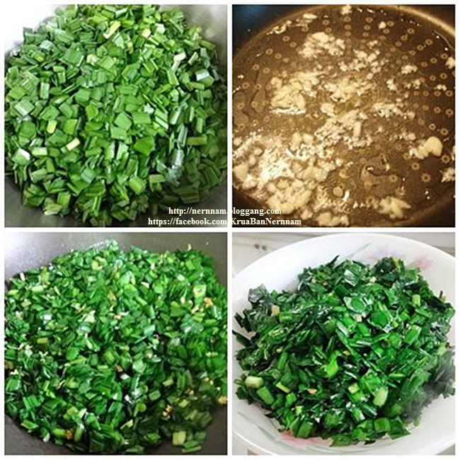 ใส่กระเทียมลงผัดพอเหลืองหอม ใ ส่กุยช่ายหมักและน้ำตาล ผัดให้สุ กนุ่ม ตักขึ้นพักไว้
