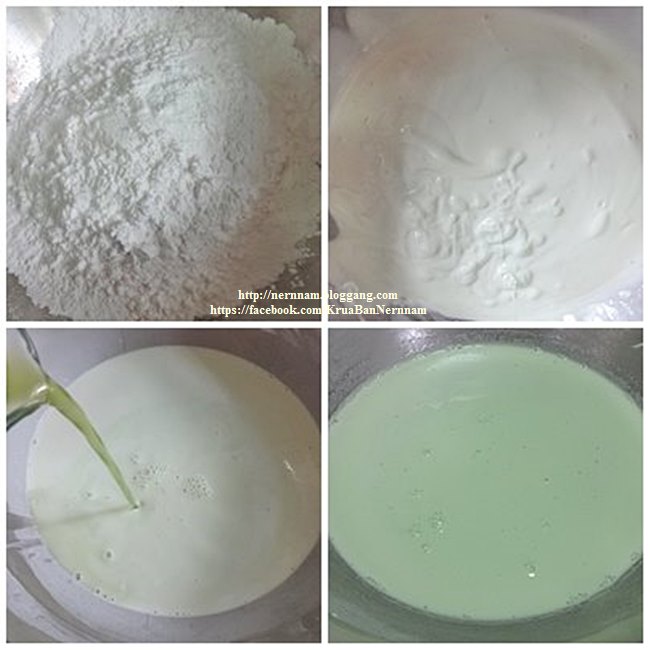 3. ทำแป้งโดยผสมแป้งข้าวเจ้า แป้งมัน และน้ำเข้าด้วยกัน ใส่น้ำทีละน้อยนวดให้แป้งละลายเข้ากัน ใส่น้ำที่เหลือจนหมด
