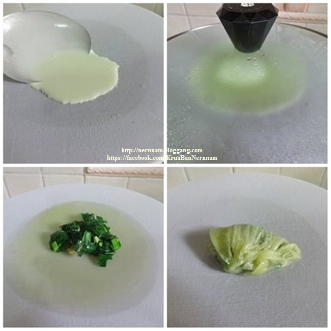5. ใช้ทั พพีตักแป้งละเลงเป็นแผ่นบาง ปิดฝ าครอบนาน 5 วินาที ตักไ ส้ กุ ยช่ายใส่ ใช้พายย างป าด