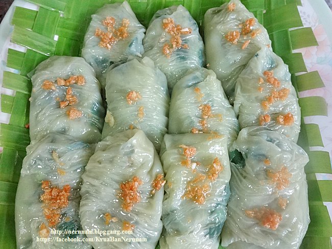 ให้แป้งย่นหุ้มไ ส้ ตักใส่จานที่มีน้ำมันเล็กน้อย