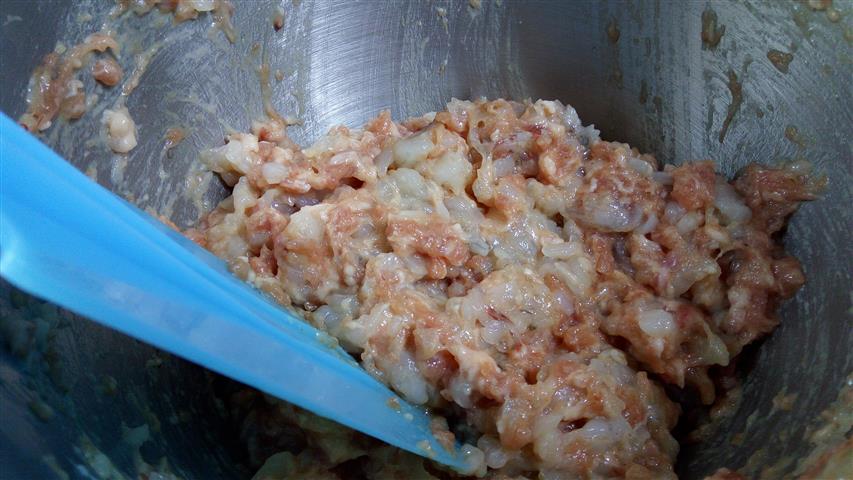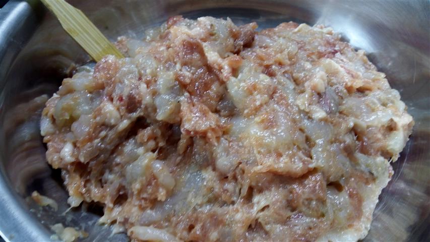 3. ตีกุ้งให้เข้ากัน ถ้าชอบแบบมีรสสัมผัสก็ตีพอแ ต กแล้วก็ผสมกัน แล้วผสมหมูบ ดลงไป