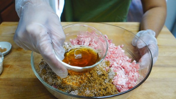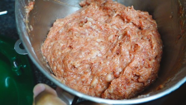 1.ใช้เ นื้ อหมูติดมัน 1 กิโลกรัม นะคะ ทำออกมาได้ 9 เส้น เยอะเหมือนกันค่ะ เริ่มด้วยนำหมูบ ดมาใส่อ่างผสม