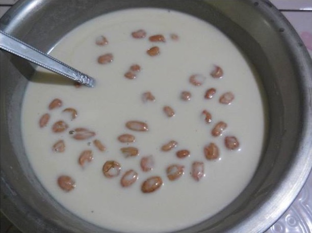 ใช้มือนวดจนส่วนผสมเข้ากันดี เติมน้ำกะทิลงไป คนให้เข้ากัน แล้วกรองด้วยกระชอนถี่ๆ หรือผ้าขาวบาง