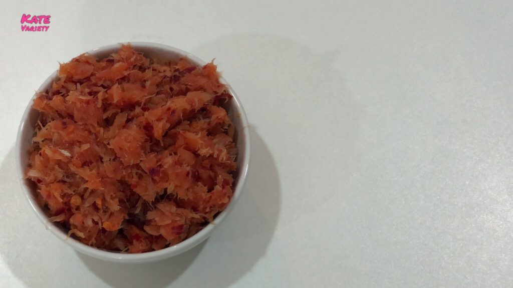 1.ตำพริกแห้งให้พอละเอียด (ปริม าณพริกตามความเ ผ็ ดที่ต้องการ) และใส่เ นื้ อป ล าเ ก๋ าล วกสุ กลงไปตำ