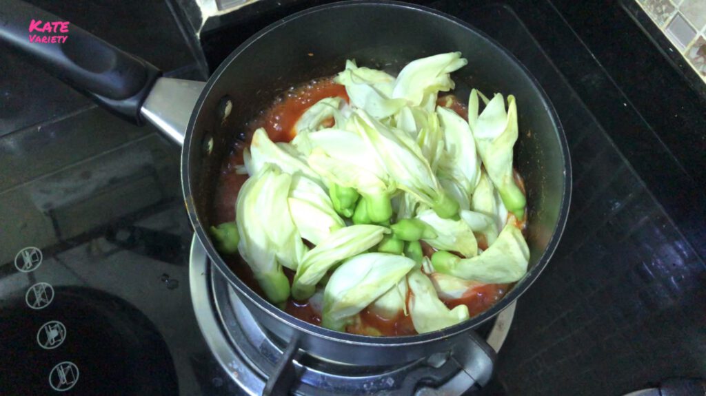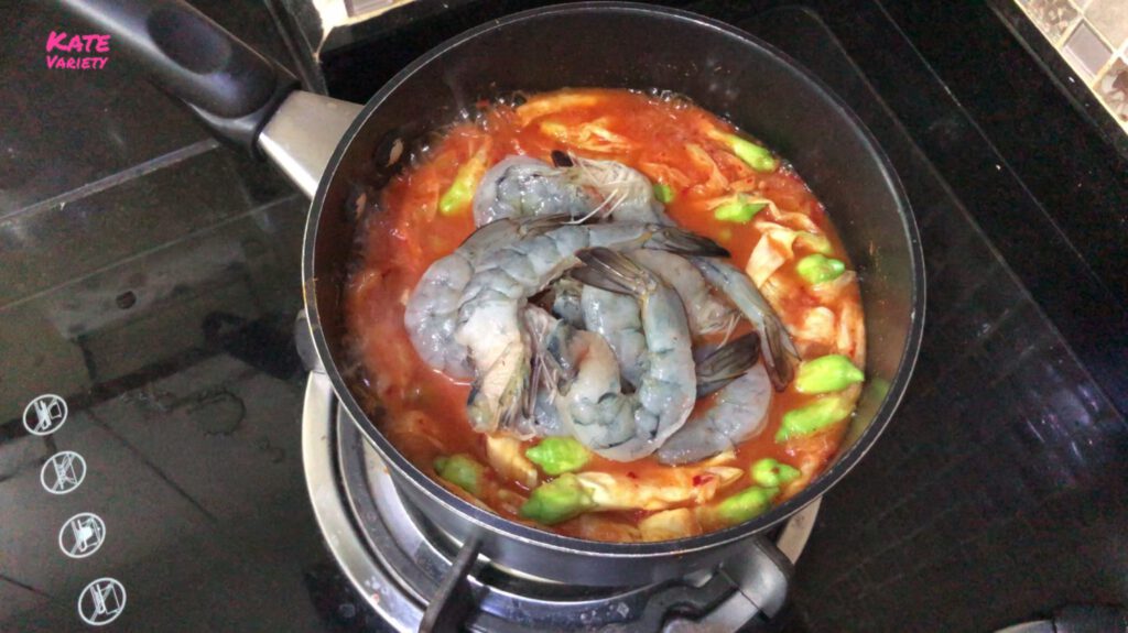 4.ใส่ ด อ กแ ค ลงไป (ด อ กแคต้องเด็ดก้านเกสรออกก่อน เพื่อไม่ให้มีรสข ม) พอด อ กแคเริ่มยุ บ ใส่กุ้งสดตามลงไปได้เลย