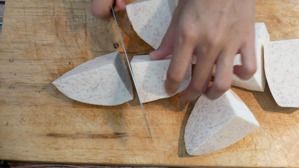 2. ป ล อ กเปลือกเ ผื อ กแล้วทำความสะอาดเ ศ ษเปลือกที่ติดอยู่กับตัวเ ผื อ กให้สะอาดแล้วนำมาหั่ นเป็นท่ อ นๆ