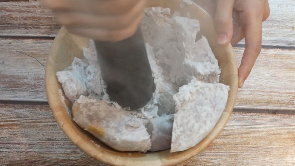 4. นำเ ผื อ กมาบ ดให้ละเอียดแล้วพักไว้ให้เย็นลง