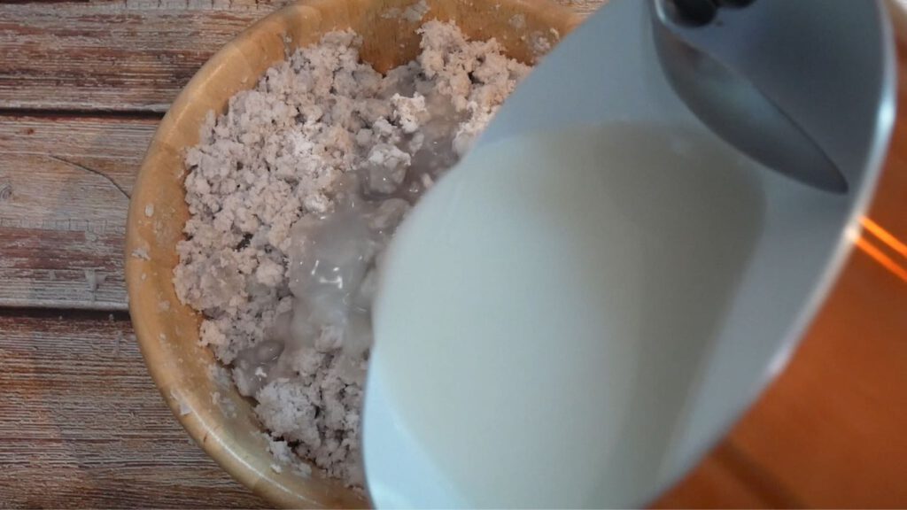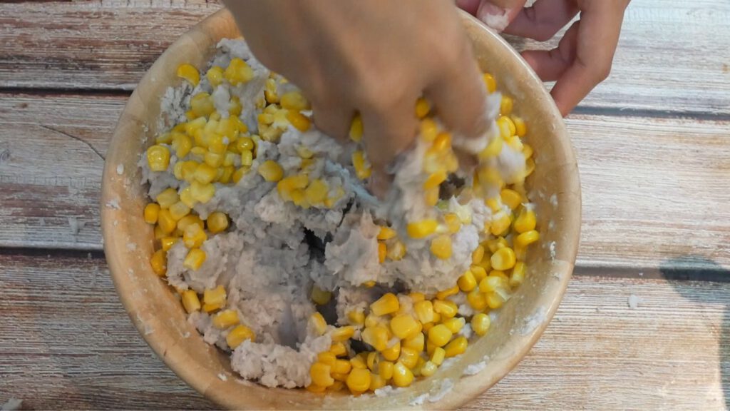 5. ใส่ผงฟู กับ น้ำกะทิที่ทำไว้ลงไปโดยค่อยๆใส่กะทิแล้วคนหรือขยำให้เข้ากับเ ผื อ กจนเป็นเ นื้ อเดียวกัน