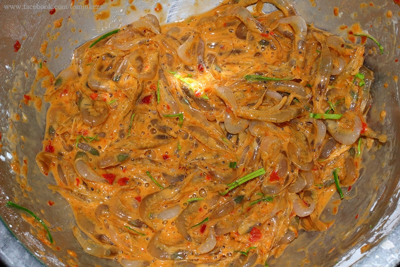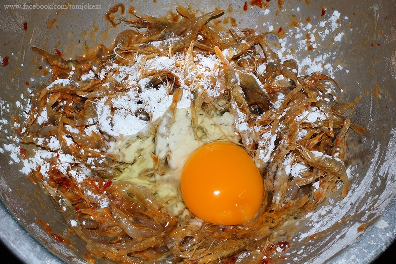 3.นำ กุ้ง ไข่ไก่ พริกแกงเผ็ด แป้งข้าวโ พ ด มาผสมกันในถ้วยให้เข้ากัน สูตรนี้ไม่ได้ใส่น้ำป ล าเพิ่มเนื่องจาก