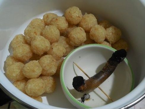 ยกลงจากเ ต า พักไว้อุ่นๆ แล้วปั้นเป็นก้อนกลม ขนาด 1.5 ซม. ทำจนหมดไส้ที่กวนไว้ อบค วั นเทียนไว้ 1 คืน