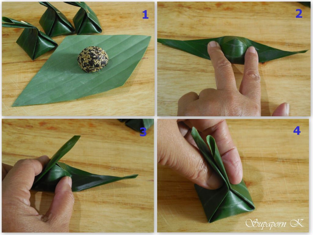 – นำไปห่อใบตอง โดยห่อขนมให้เป็นรูปปิร ามิ ดฐานสี่เหลี่ยม (ตามลักษณะของขนมเทียน) แล้วกลัดด้วยไม้กลัด