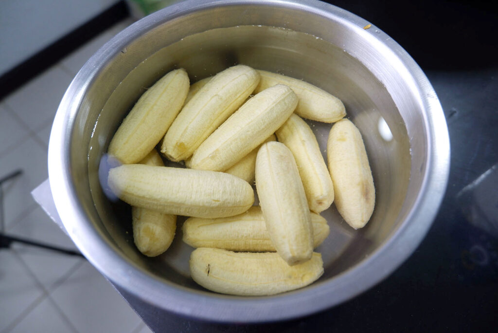 2. ใส่น้ำลงในหม้อ ประมาณ 1 ลิตร ระหว่างรอก็ป อ กกล้วยแล้วแช่ในน้ำเกลือไว้ก่อน