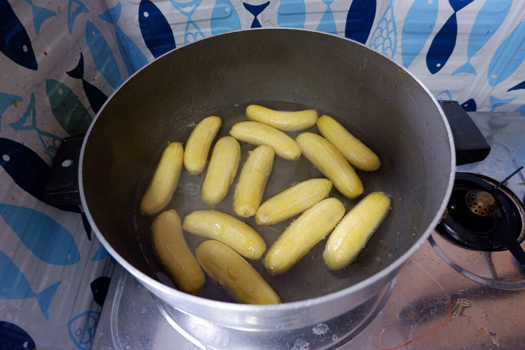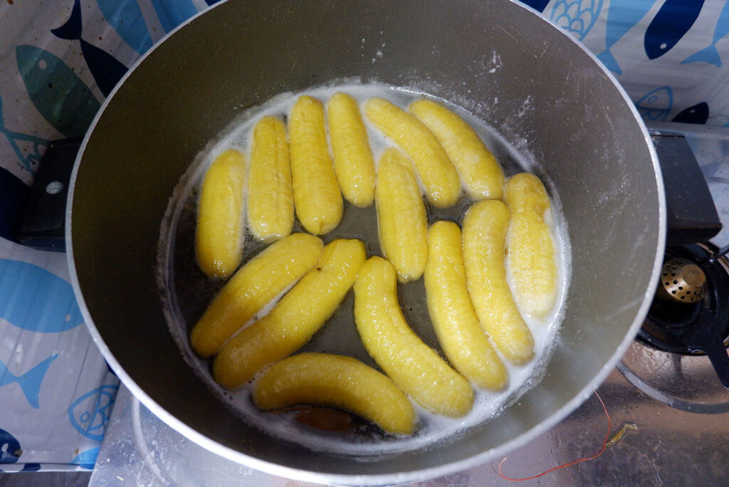 6. ต้มจนกล้วยเป็นสีเหลืองและนิ่ม (เวลากล้วยใกล้จะใช้ได้แล้ว มันจะพองตัวขึ้นค่ะ)