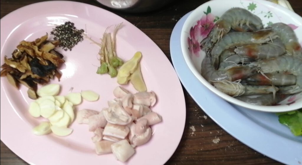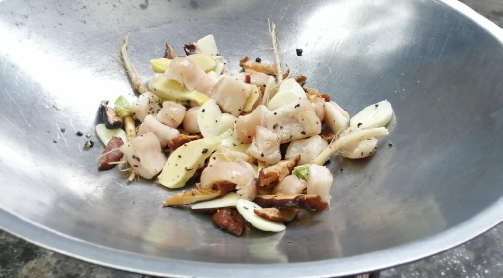 6.ใส่ขิ ง ร ากผักชี กระเทียม พริกไทยดำ เห็ดหอมลงไปผัดกับมันหมูให้หอม