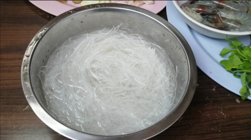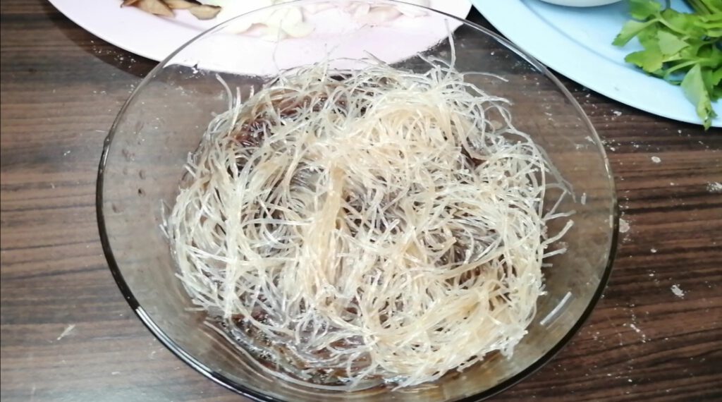 2.นำวุ้นเส้นมาแช่น้ำ 30 นาที ใช้เป็นวุ้นเส้นแห้งนะคะ