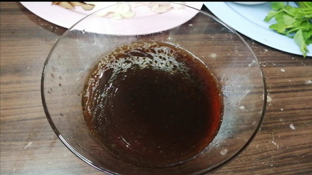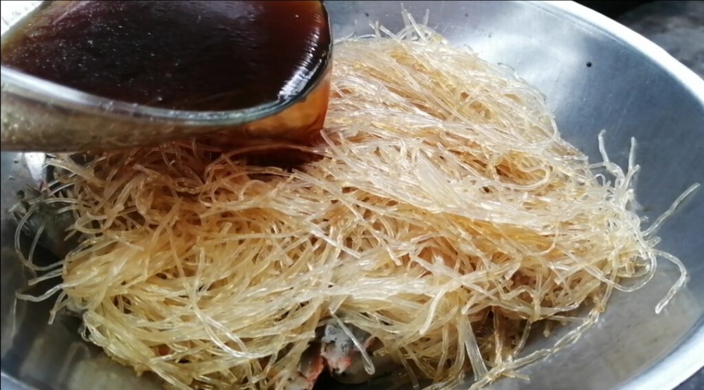 5.น้ำวุ้นเส้น ลงไปแช่ในน้ำซอสที่เราทำไว้ อีกรอบค่ะ