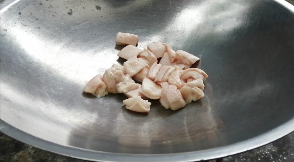 6.นำกระทะตั้งไ ฟ ใส่มันหมูลงไปผัด จนน้ำมันเริ่มออก ใช้ไ ฟกลางนะคะ